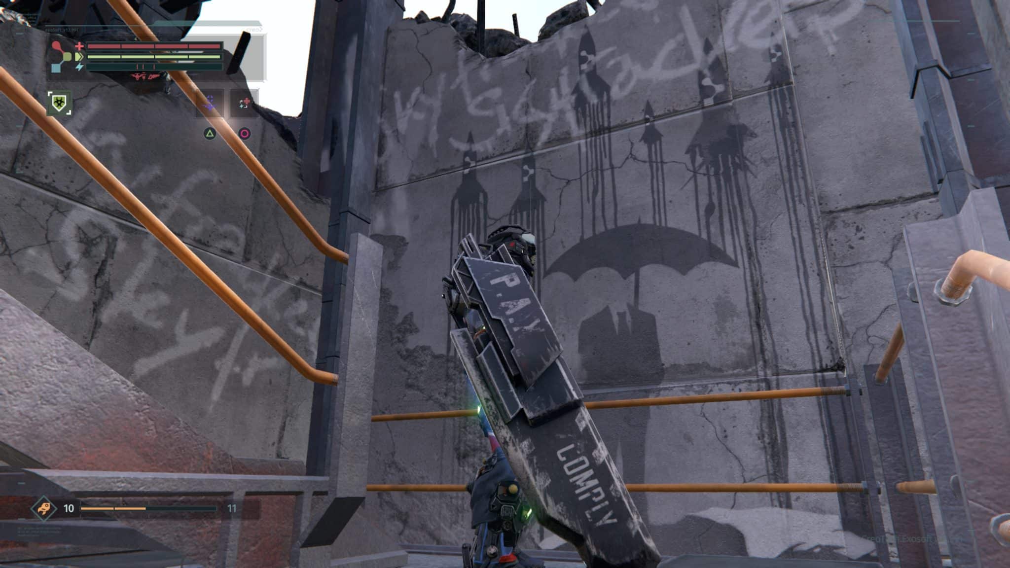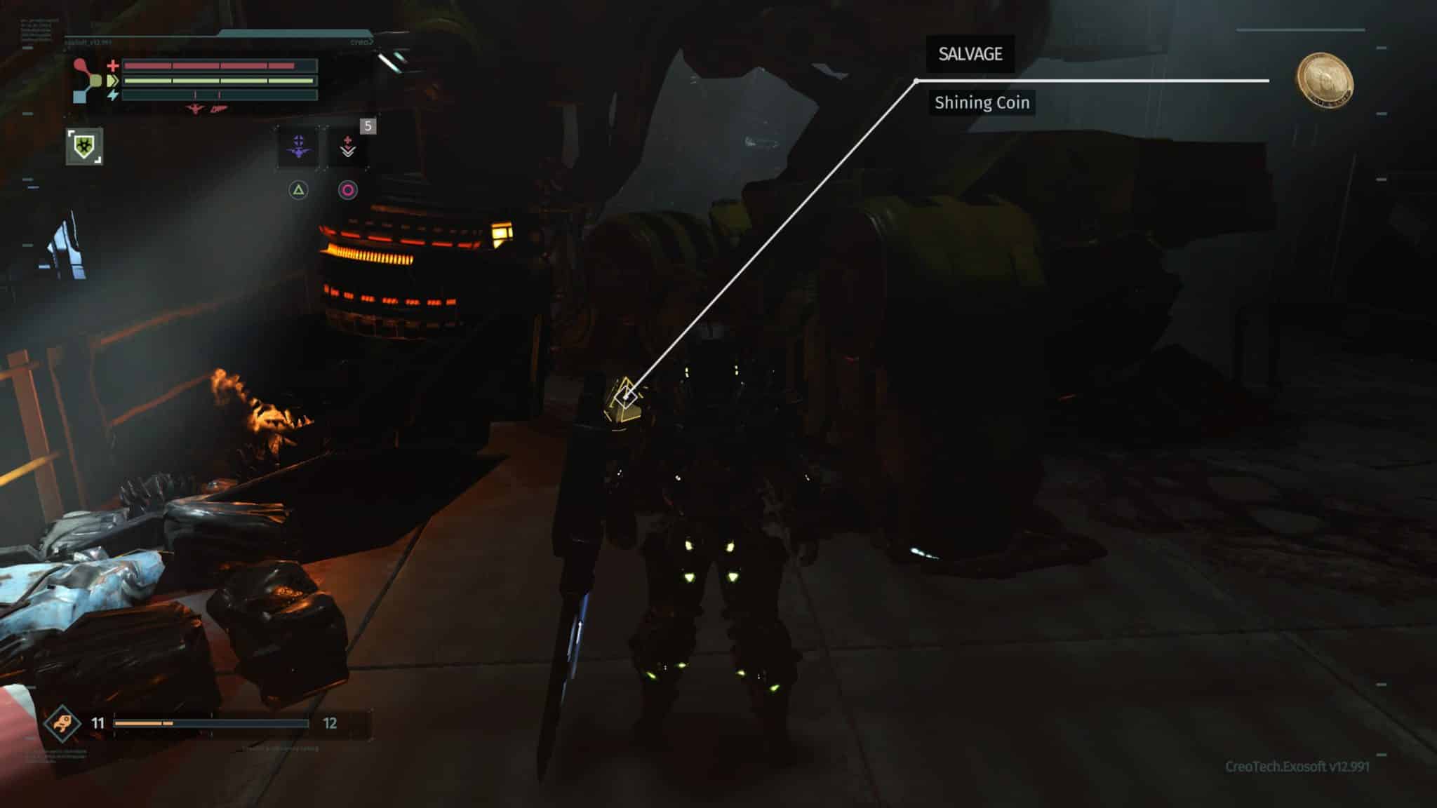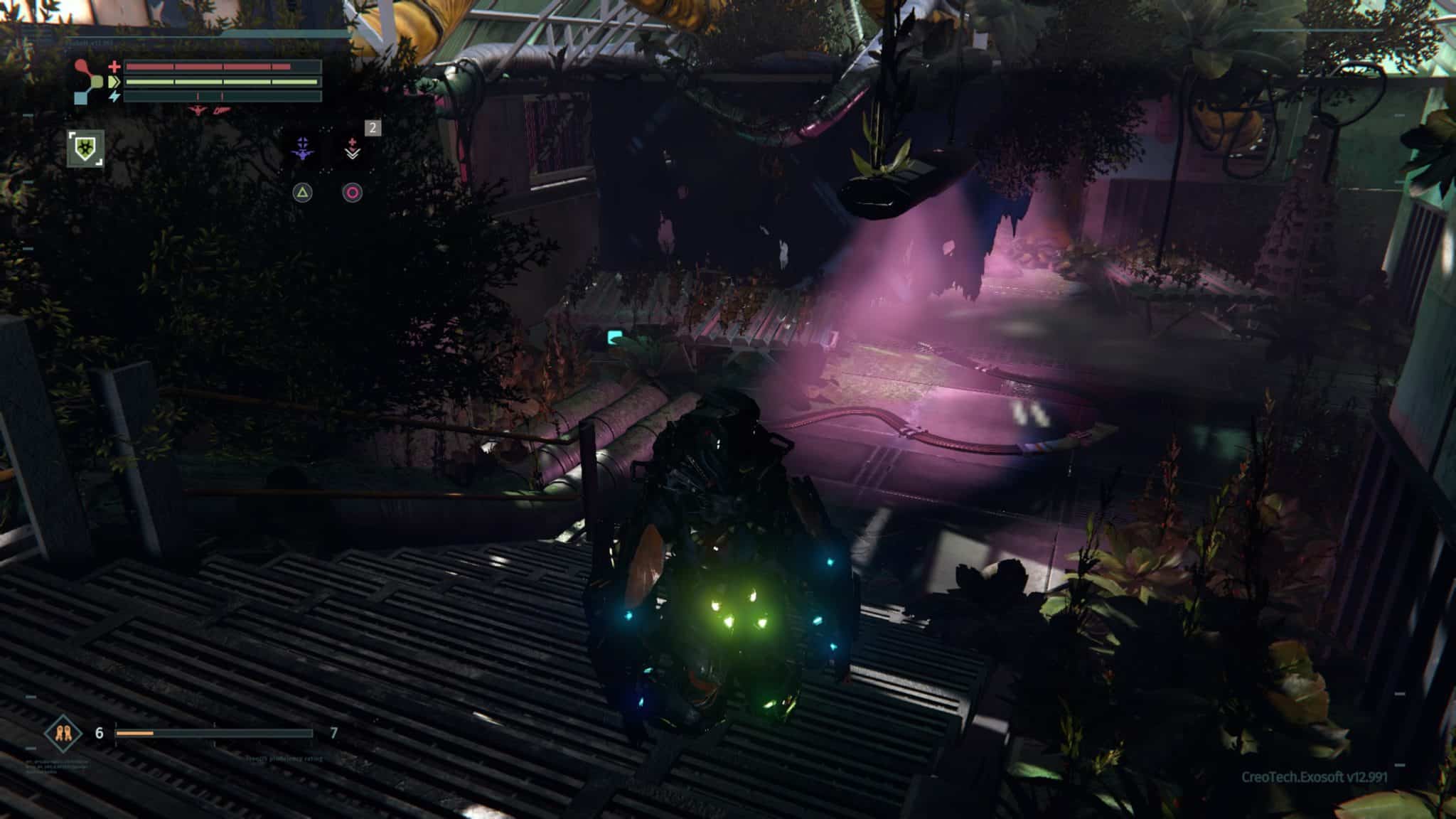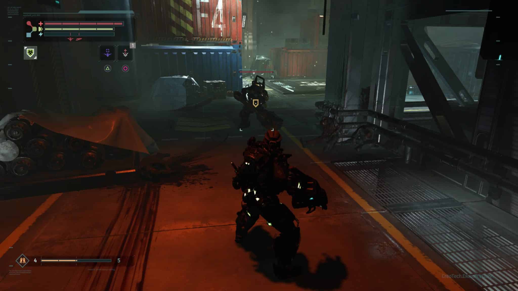 We rejoin Warren as he regains consciousness in a scrap yard, scheduled to be “recycled.” CREO has undergone some sort of cataclysm, rendering his Rig only partially functional and thrusting Warren into the single worst new job orientation ever. The player is ushered through an introduction of the basic controls as you are tasked to find a replacement battery for your Rig. Conveniently, even without full functionality, the Rig affords Warren not only the ability to walk once more, but also the strength and speed to fend off his attackers.