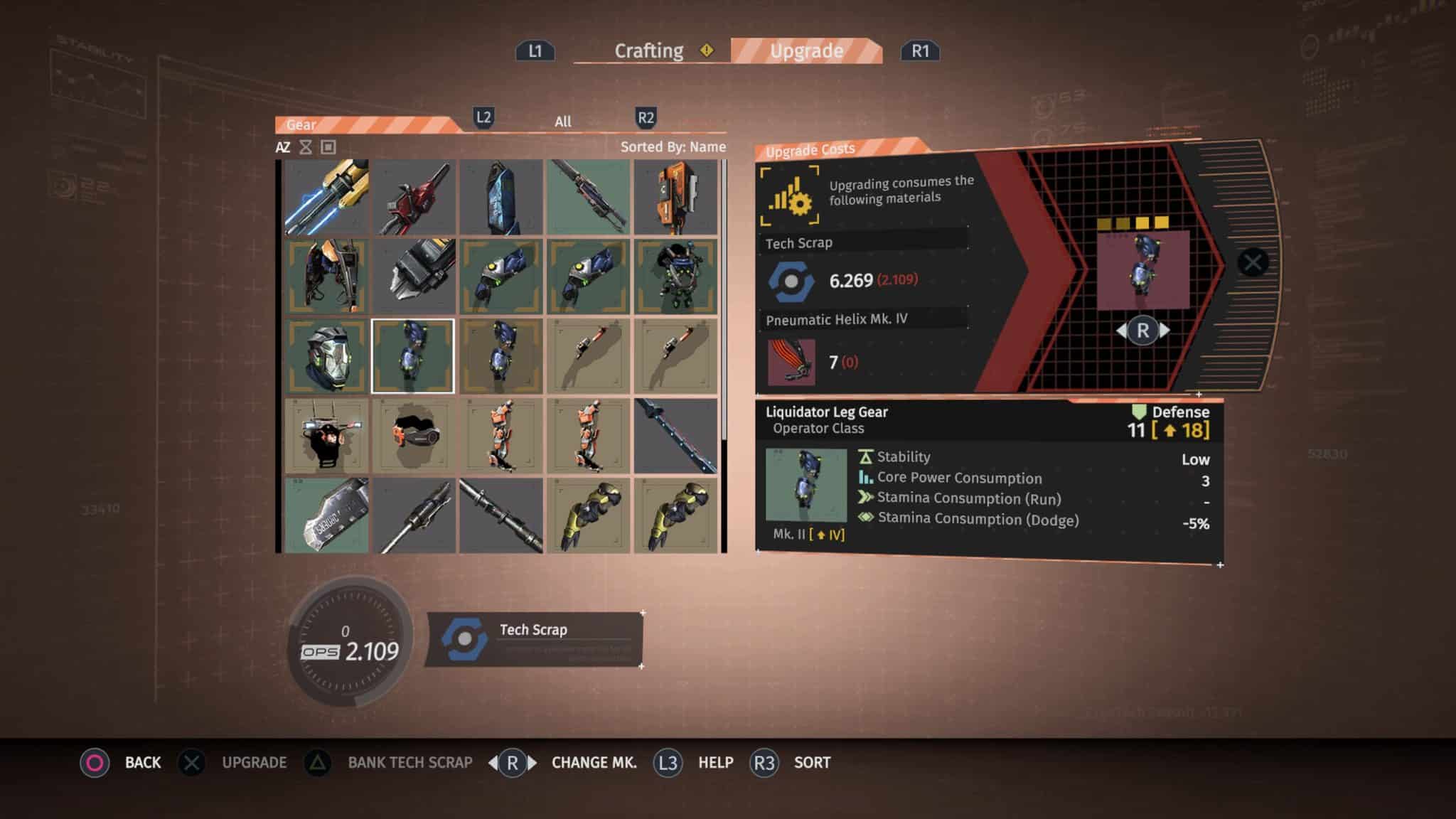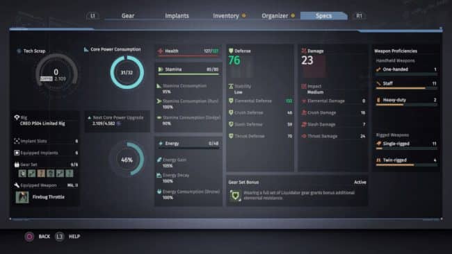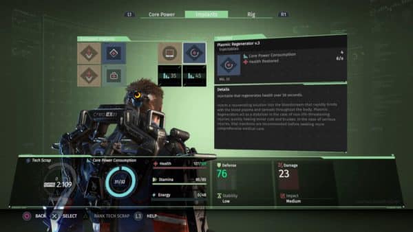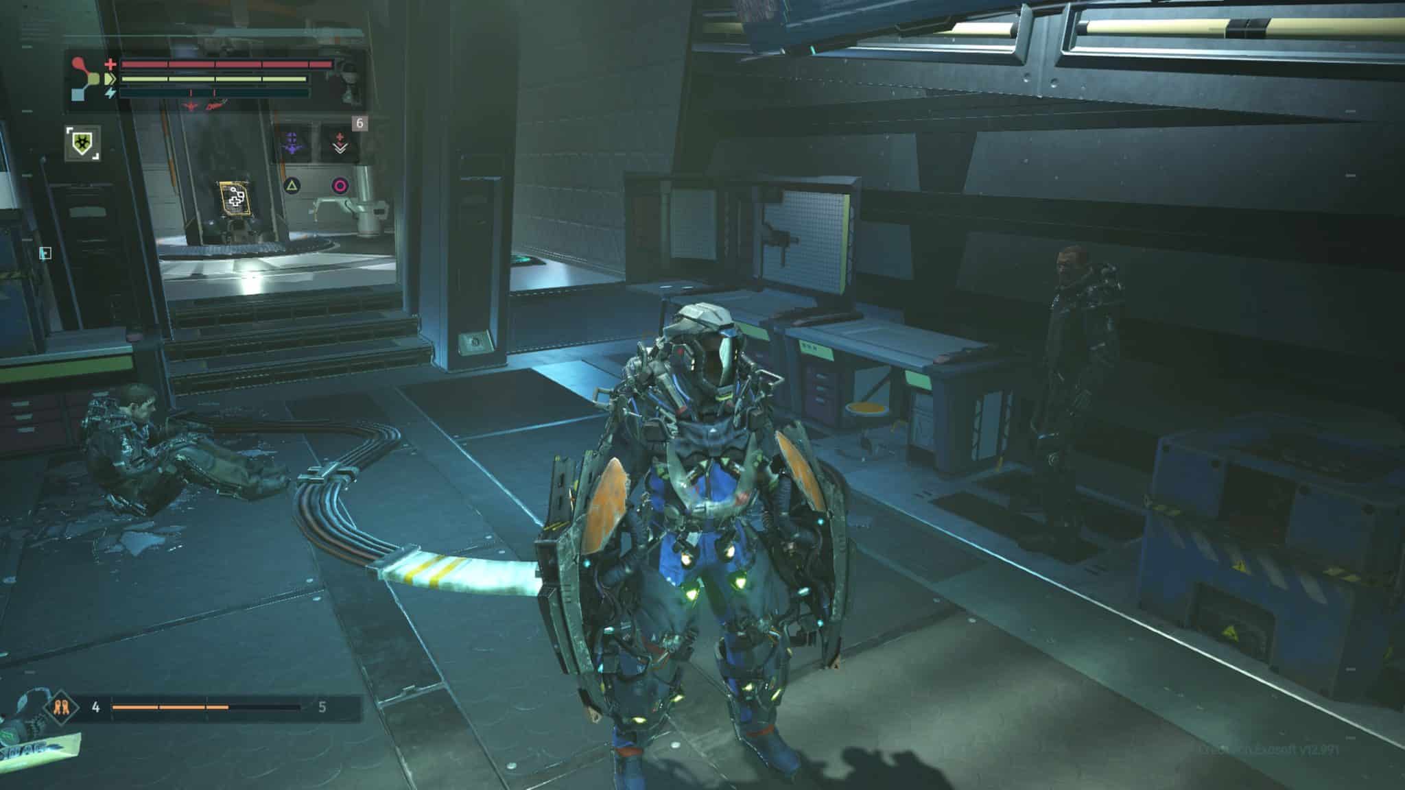 Acquiring new gear is essential in The Surge, as it is the only available method of player advancement. As in similar games, experience is granted to the player as enemies are slain. This experience is spent not only developing the player character’s abilities, but also in crafting or improving equipment. Deck 13 deviates from standard progression systems by removing character stats entirely. Whereas in Dark Souls players are able to invest in increased health pools, higher damage-dealing stats, faster movement speeds, or other similar bonuses upon each level gained, The Surge rewards players with more “Core Energy” as they ascend in level.