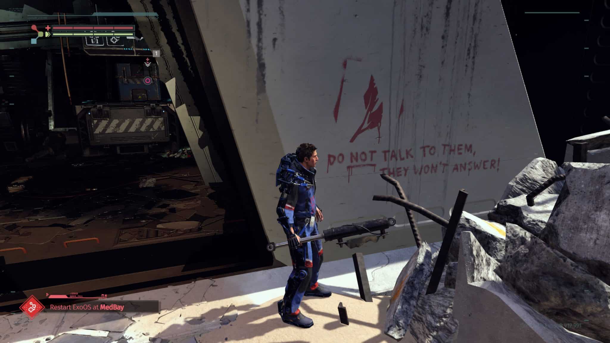 This narrative continues to darken as Warren moves further into the CREO facility. Environments in The Surge are vivid labyrinths, all distinct from one another. The CREO compound is a multifaceted place, through which the player will explore everything from ruined factories, to near-pristine office buildings, and subterranean laboratories, all of which play host to phenomenal environmental storytelling. This pops up in multiple forms such as the graffiti scrawled various on walls throughout the complex. Most of this seems to be created after the disaster, as the messages left are a mix of personal outcry and advice for potential survivors. The storytelling is further fleshed out by audio logs left by employees before the CREO disaster took place as well as those trying to survive it.